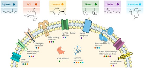 Illustration summarizing the main molecular targets and mechanisms of action of selected cannabis-derived terpenes involved in analgesic and anti-inflammatory pathways. Each coloured dot corresponds to a specific terpene and its associated interaction or effect on cellular signalling pathways. Abbreviations: BCP—β-Caryophyllene, TRPV1—Transient Receptor Potential Vanilloid 1, CB—Cannabinoid, TLR4—Toll-Like Receptor 4, Na+/Ca2+—Sodium/Calcium channels, NMDA—N-Methyl-D-Aspartate receptor, AChE—Acetylcholinesterase, PPAR-γ—Peroxisome Proliferator-Activated Receptor gamma, GABA—Gamma-Aminobutyric Acid, A2A—Adenosine receptor subtype A2A.