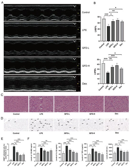 The echocardiography results indicated that, compared to the control group, left ventricular systolic function (Figure 1A) and LVEF and LVFS (Figure 1B) were obviously impaired in the LPS group mice, indicating that LPS could induce cardiac dysfunction in mice. QFD (3 and 6 g/kg) treatment reversed the LPS-induced decrease in LVEF and LVFS. Histopathological analysis revealed that the myocardial tissue of the LPS-induced mice showed obvious cytoplasmic vacuolation and loose deformation of the cardiac muscle fiber structure. QFD treatment effectively moderated the above morphological changes in the SIC mice (Figure 1C). CD68 is highly expressed in macrophages and is a signal of inflammation in vivo. During sepsis, CD68-positive cells accumulate in cardiac tissues [17]. As shown in Figure 1D,E, there was an evident change in the proportion of CD68-positive cells in the LPS group, which was effectively mitigated by QFD and Dex. Additionally, the serum levels of proinflammatory factors (IL-1β and TNF-α) and markers of myocardial damage (CK-MB and LDH) in the SIC mice significantly increased, indicating that LPS caused serious inflammation and myocardial injury. QFD treatment reduced the serum levels of LDH, CK-MB, IL-1β, and TNF-α by 28.7%, 32.3%, 38.6%, and 36.7%, respectively (Figure 1F).