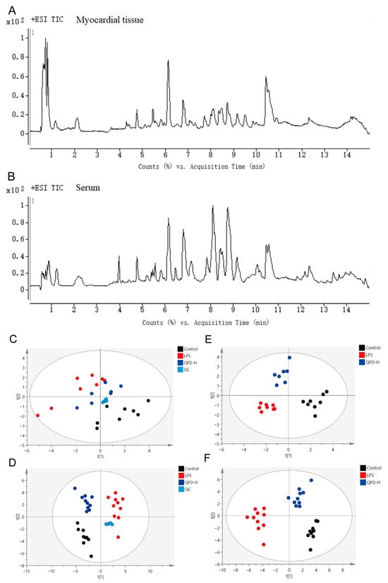 Typical total ion current (TIC) chromatograms are presented in Figure 2A,B. The repeatability of the analytical strategy was assessed by calculating the relative standard deviation (RSD) of the intensity of all peaks in the QC samples, and 91.5% ion features in the serum QC sample and 90.0% in the myocardial QC sample were less than 30% after peak alignment, filtering, and normalization, suggesting good repeatability of the analytical strategy. Additionally, PCA score plots of the real samples and QC sample clearly showed that QCs clustered tightly together (Figure 2C,D), forcefully confirming the stability and reliability of the analytical strategy. PLS-DA score plots showed an obvious separation among the control, LPS, and QFD-H groups, with the QFD-H group being close to the control group (Figure 2E,F), which was consistent with the PCA score plots. These results suggest that LPS disrupted metabolism in the SIC mice and that QFD-H could reverse the metabolic disorders.