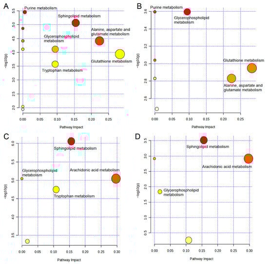 Metabolic pathway enrichment analysis of the significantly changed metabolites in myocardial samples of LPS-induced mice (A) and QFD-treated mice (B) and in serum samples of LPS-induced mice (C) and QFD-treated mice (D). The larger the circle, the greater the impact on this pathway, and the redder the circle, the higher the credibility.
