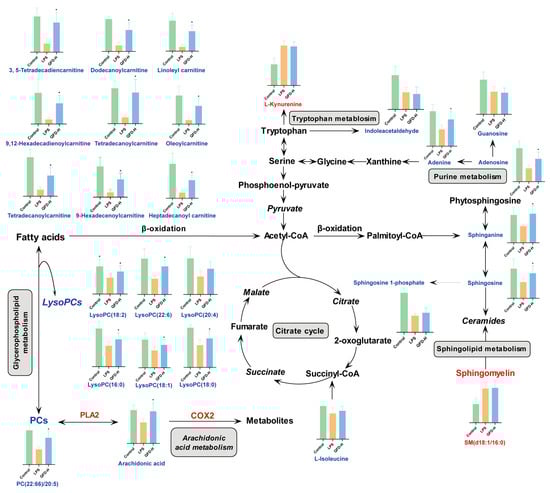 KEGG database-based metabolic network of LPS-induced cardiomyopathy and QFD modulation. Significantly increased and decreased metabolites in LPS group compared to in control group are marked in red and blue, respectively. Data are expressed as mean ± SD. * p < 0.05, compared with LPS group.