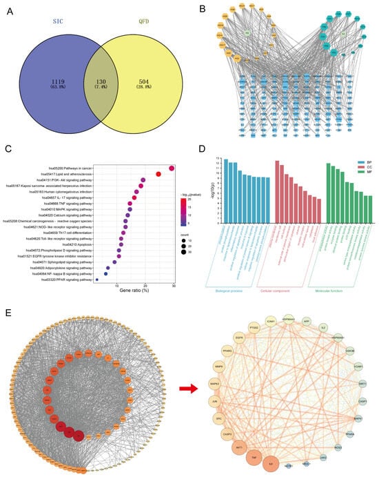 Network pharmacology-based mechanism analysis of QFD against SIC. (A) Wayne diagram. (B) Component–target network diagram of QFD against SIC. Components and genes are shown in different sizes according to their degree values. HQ 1-17 and FZ 1-13 correspond to the compositional information in Tables S4 and S5, respectively. Abbreviations: HQ, Huangqi; FZ, Fuzi. (C) KEGG pathway bubble map. (D) Bar chart of GO enrichment analysis for the BP-CC-MF triad. (E) Core genes screened from the PPI network. On the left is the visualized PPI network mapped with Cytoscape. The larger the degree value of the gene, the larger the shape and the redder the color. On the right is the network of the 26 core genes screened using Cytoscape. The larger the shape and the more orange the color, the more significant their role in the whole network. The thicker the connecting line between the genes, the more significant the interaction between the genes.
