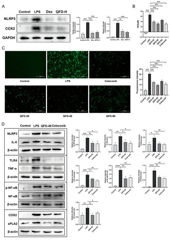 Given the many inflammatory pathways and targets identified by metabolomics and network pharmacology, we further verified the ameliorative effect of QFD on inflammation. The expression levels of NLRP3 and COX2 were measured in the myocardium of the SIC mice, and the results showed that two proteins significantly increased in the LPS group and significantly decreased after QFD and Dex treatment (Figure 6A). Macrophage-mediated inflammation has been shown to cause SIC [18,19], so LPS-induced RAW 264.7 cells were used to further investigate the potential anti-inflammatory mechanism of QFD during SIC. Upon exposure to LPS, the NO and ROS production of RAW 264.7 cells notably increased, which was significantly reverted by QFD (20, 40, and 80 μg/mL) (Figure 6B,C). Due to having the most pronounced effect, QFD-40 was chosen as the treatment group for subsequent Western blot analysis. As shown in Figure 6D, we measured the protein levels of TLR4 and p-NF-κB p65, including their downstream NLRP3, IL-6, and TNF-α. Moreover, the protein levels of sPLA2 and COX2 were also determined. QFD treatment significantly decreased the expression of the above proteins. These results suggest that QFD could regulate the TLR4/NF-κB/NLRP3 inflammatory pathway, glycerophospholipid metabolism, and arachidonic acid metabolism, thereby exerting an anti-inflammatory effect in SIC.