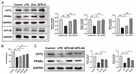 Due to the notable changes in the content of acyl-carnitines in metabolites, it was speculated that fatty acid oxidation (FAO) was affected during SIC. In addition, network pharmacology suggested that the PPAR signaling pathway and PPARα play an important role in QFD against SIC. Therefore, the expression levels of three key proteins involved in FAO, namely, PPARα [20] and its downstream CPT1B and CPT2 [21], were determined. The levels of the three proteins were evidently higher in the heart tissues of the SIC mice in the QFD and Dex groups than in those in the LPS group (Figure 7A). Based on the results of a CCK-8 assay (Figure 7B), two concentrations of QFD-40 and QFD-80 were selected for further Western blot analysis, and QFD also evidently upregulated the expression of PPARα and CPT2 in H9c2 rat cardiomyocyte cells (Figure 7C).