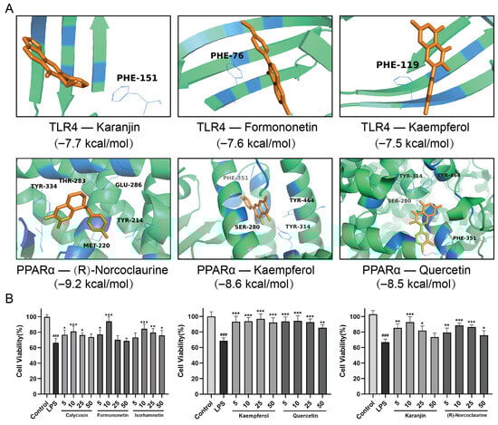 Based on the results of the ingredient identification of QFD and network pharmacology, nine components were docked with two upstream targets, PPARα and TLR4, to further validate the effects of QFD on both the TLR4/NF-κB/NLRP3 and PPARα/CPT pathways. It is generally believed that docking binding energies below −5.0 kcal/mol indicate good binding activity, while energies below −7.0 kcal/mol indicate strong binding activity [22]. Table S7 displays the docking scores, and most active ingredients had a docking binding energy of less than −7.0 kcal/mol with these two targets, indicating a high affinity. MM/GBSA was used to determine the binding free energy of the docked compounds. The more negative the binding free energy value, the greater the stability of the complex. Table S8 shows the MM-GBSA results, which were all negative, confirming stable binding to the protein. Figure 8A shows the binding patterns of TLR4 and PPARα with some components with strong interactions; for example, karanjin bound to TLR4 through PHE-151, and (R)-norcoclaurine bound to PPARα through five amino acids: TYR-334, THR-283, GLU-286, TYR-214, and MET-220. Additionally, we verified the ameliorative effect of seven active ingredients on SIC by measuring the viability of H9c2 cardiomyocytes. As shown in Figure 8B, compared with the LPS group, these seven active ingredients all led to a significant increase in the cell survival rate, especially kaempferol and quercetin, which showed good protective effects at 5 μM.