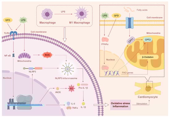 Studies have demonstrated that, in the early stages of sepsis, interferon-γ and LPS can induce macrophage M1-like polarization, thereby promoting the production of inflammatory factors [57]. This damages cardiomyocytes and triggers cardiac dysfunction [58]. During sepsis, cardiomyocyte damage may be attributed to activation of M1-like macrophages [59,60], and the levels of inflammatory factors reach their peak around 12–24 h [61]. LPS stimulation alone did not significantly affect the induction of inflammatory damage in H9c2 cells [62]. Therefore, we co-cultured H9c2 cells with culture supernatants from LPS-stimulated RAW 264.7 cells to simulate the state of myocardial cell damage caused by sepsis. We finally found a significant decrease in cell viability and a decrease in the protein levels of PPARα and CPT2. Based on these results, we speculated that LPS induced the M1 polarization of macrophages, which increased NO and ROS production and activated the TLR4/NF-κB/NLRP3 pathway, thereby producing pro-inflammatory factors such as IL-6 and TNF-α, which, in turn, led to cardiomyocyte damage and FAO impairment (Figure 9). QFD significantly restored the levels of PPARα, CPT1B, and CPT2, suggesting that it can regulate FAO by activating the PPARα/CPT pathway, thereby maintaining myocardial energy metabolic homeostasis, which may be another key mechanism of QFD against SIC.