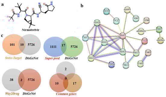 The identification of overlapping targets between Nirmatrelvir and hepatocellular carcinoma (HCC). A Venn diagram was generated to illustrate the intersection between the predicted molecular targets of Nirmatrelvir and the disease-associated genes linked to HCC. Nirmatrelvir targets were retrieved from SwissTargetPrediction and SEA databases, while HCC-related genes were compiled from GeneCards, DisGeNET, and OMIM. The resulting overlap represents the common genes that may mediate the therapeutic effects of Nirmatrelvir in the context of liver cancer. Disease and Nirmatrelvir-associated common targets: (a) the two-dimensional structure of Nirmatrelvir. (b) The protein–protein interaction network of common targets. (c) The common targets according to Venn diagrams.