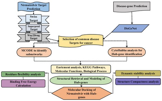 To identify potential targets of Nirmatrelvir in HCC, three drug target prediction platforms were employed: SwissTargetPrediction (http://www.swisstargetprediction.ch/) (accessed on 10 November 2024) [52], SuperPred (https://prediction.charite.de/) (accessed on 10 November 2024) [53], and Way2Drug (https://www.way2drug.com/clc-pred/) (accessed on 10 November 2024) [54]. The Canonical SMILES of Nirmatrelvir was obtained from the ChemSpider database, and queries were made into each database to obtain the pharmacologically relevant targets. Additionally, DisGeNet (https://www.disgenet.org/search) (accessed on 12 November 2024) was used to retrieve genes associated with HCC by searching for the term “hepatocellular carcinoma.” Subsequently, drug-related targets and HCC-associated genes were overlapped to identify common therapeutic targets. The shared proteins were further analyzed and used to construct a protein–protein interaction (PPI) network, which formed the basis for subsequent experimental steps. A visual representation of the overall methodology is provided in Figure 2.
