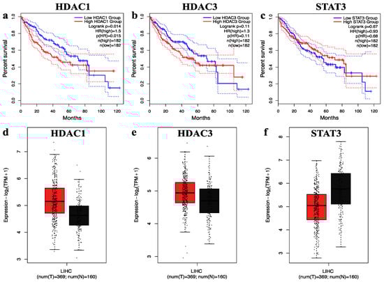 The overall survival and expression analysis of selected hub genes. (a–c) The overall survival of HDAC1, HDAC3, and STAT3 genes in hepatocellular carcinoma. (d–f) The relative expression levels of HDAC1, HDAC3, and STAT3 genes in hepatocellular carcinoma shown by the red and black boxes, which correspond to the tumor and normal sample, respectively.