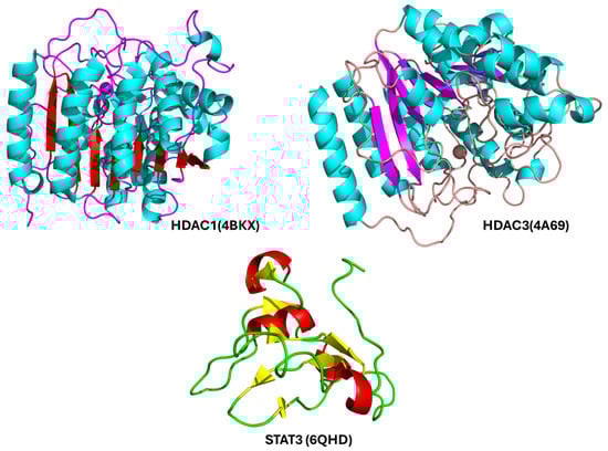 Molecular docking serves as a crucial in silico technique for investigating the interaction between drug candidates and target proteins. It provides a detailed understanding of how a compound may align within a protein’s active site, assessing both the strength and nature of the interaction. In this research, docking simulations were utilized to examine how effectively Nirmatrelvir can associate with the identified key proteins, offering insights into its therapeutic potential [40]. To perform the docking analysis, the crystal structures of the target proteins HDAC1 (PDB ID: 4BKX), HDAC3 (PDB ID: 4A69), and the SH2 domain of STAT3 (PDB ID: 6QHD) were retrieved from the Protein Data Bank. Binding site residues were selected based on evidence from previous studies to ensure accuracy in docking predictions. The 3D conformations of these target proteins used in the docking simulations are illustrated in Figure 5.