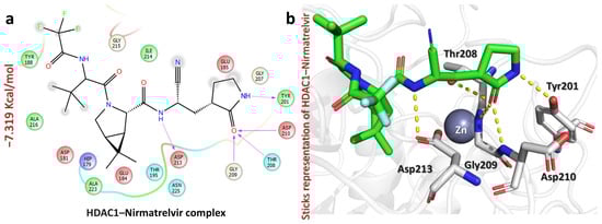 The figure shows how Nirmatrelvir interacts with the HDAC1 target. (a) The 2D interaction pattern of Nirmatrelvir with HDAC1. (b) The 3D interaction pattern of Nirmatrelvir with HDAC1. The most relevant amino acid positions are shown.