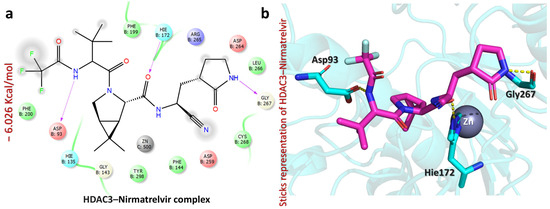 Furthermore, the HDAC3–Nirmatrelvir complex revealed a docking score of −6.026 kcal/mol, suggesting a notable interaction between the ligand and the protein active site (Figure 7). A closer look at the binding interactions highlights key stabilizing forces within the complex with residues like Asp93, Hie172, and Gly267 (Figure 7) [41]. The carbonyl of trifluoroacetamide forms a strong hydrogen bond with Asp93 (1.92 Å), while the carbonyl of cyanoethylacetamide interacts with Hie172 (1.93 Å), and the NH of pyrrolidin-2-one establishes a hydrogen bond with Gly267 (2.05 Å) (Figure 7). These interactions indicate that Nirmatrelvir engages with HDAC3 through a network of hydrogen bonds, potentially influencing protein activity. Further computational studies, such as molecular dynamics simulations and free energy calculations, would be valuable to understand the stability and long-term interaction of Nirmatrelvir within the HDAC3 binding site.