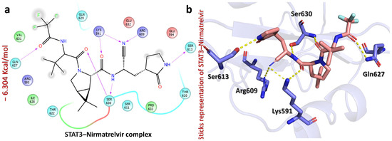 The figure shows the bonding network of the Nirmatrelvir–STAT3 complex. (a) The 2D interaction pattern of Nirmatrelvir with STAT3. (b) The 3D interaction pattern of Nirmatrelvir with STAT3. The most relevant amino acid positions are shown.
