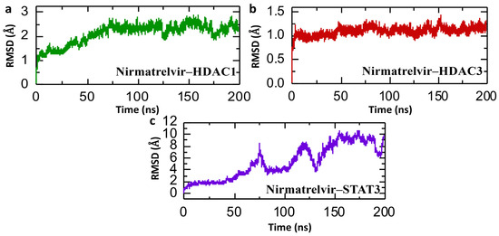 Dynamic stability simulation of Nirmatrelvir–protein complexes. (a) The RMSD trajectories for the Nirmatrelvir–HDAC1 complex. (b) The RMSD trajectories for the Nirmatrelvir–HDAC3 complex. (c) The RMSD trajectories for the Nirmatrelvir–STAT3 complex throughout a 200 ns simulation.