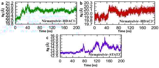 Post-simulation structural compactness analysis of Nirmatrelvir–protein complexes. (a) The compactness of the Nirmatrelvir–HADC1 complex as Rg. (b) The compactness of the Nirmatrelvir–HDAC3 complex as Rg. (c) The compactness of the Nirmatrelvir–STAT3 complex as Rg throughout the 200 ns simulation.