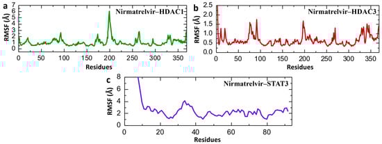 Root Mean Square Fluctuation (RMSF) analysis serves as a key indicator of the flexibility and mobility of specific regions within a biomolecule or between interacting molecules during molecular dynamics (MD) simulations. It helps pinpoint flexible segments that may be critical for ligand binding or protein–protein interactions. Additionally, RMSF is instrumental in validating the reliability of MD simulations by comparing simulated fluctuation profiles with those obtained from experimental data [48,49]. Figure 11 presents the Root Mean Square Fluctuation (RMSF) analysis of individual amino acid residues for Nirmatrelvir in complex with HDAC1, HDAC3, and STAT3, providing insight into local flexibility and dynamic regions within the protein structures over the course of the 200 ns simulation. Nirmatrelvir–HDAC1 exhibits moderate fluctuations with peaks around residues at ~80, ~200, and ~260, and a significant spike near residue 200 reaching ~6.5 Å (Figure 11a), indicating localized flexibility in the loop region, while most of the structure remains below 2 Å, suggesting general structural rigidity with specific flexible loops. Similarly, Figure 11b shows an overall lower RMSF profile of Nirmatrelvir–HDAC3 and Nirmatrelvir–HDAC1, with values mostly below 1 Å and only minor spikes near residues 90, 200, 270, and 350, reflecting a more uniformly stable structure with fewer flexible regions. In contrast, Nirmatrelvir–STAT3 shows drastically different behavior, with RMSF values reaching above 7 Å at the N-terminus and maintaining high variability throughout the structure, particularly in the first 40 residues (Figure 11c), highlighting substantial local instability and disorder in the STAT3 complex upon Nirmatrelvir binding. The repetition of the simulation for both HDAC1, HDAC3, and STAT3 showed consistent RMSF profiles, confirming the reproducibility of the results. The RMSF data align well with both RMSD and Rg findings. HDAC3 consistently exhibits the lowest residue-level fluctuations, overall RMSD, and compact Rg values, confirming its highly stable interaction with Nirmatrelvir. HDAC1 displays moderate fluctuations and flexibility, especially in certain loop regions, which is consistent with its moderate RMSD and Rg profiles. In contrast, STAT3 shows high RMSF peaks, mirroring the large RMSDs and Rg instability identified, signifying a lack of structural integrity and stable binding with Nirmatrelvir.