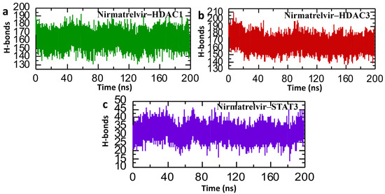 In the context of post-simulation analysis, hydrogen bonds play a critical role in determining the stability and strength of protein–ligand interactions. Monitoring these bonds throughout molecular dynamics simulations provides valuable insights into how binding affinity is regulated over time. This information helps elucidate key biological mechanisms, the molecular basis of disease progression, and the impact of genetic mutations on protein interaction networks and signaling pathways. Therefore, to check the binding stability of the Nirmatrelvir drug with selected target proteins, we calculated the average of post-simulation hydrogen bonds. The post-simulation hydrogen bond analysis of the Nirmatrelvir–protein complexes (HDAC1, HDAC3, and STAT3) over a 200 ns molecular dynamics simulation revealed insights into the stability and interaction dynamics of the drug with each target. For the Nirmatrelvir–HDAC1 complex, the number of hydrogen bonds fluctuated within a relatively stable range of approximately 130–190, indicating consistent interactions throughout the simulation, with the average number of hydrogen bonds being around 160 (Figure 12a). Furthermore, the Nirmatrelvir–HDAC3 complex displayed a similar trend, maintaining a dense and steady hydrogen bonding pattern within the 140–200 range, which suggests a strong and stable binding interface with average hydrogen bonds of around 170 (Figure 12b). In contrast, the Nirmatrelvir–STAT3 complex showed a significantly lower number of hydrogen bonds, fluctuating roughly between 15 and 45, implying the presence of weaker or more transient interactions compared to the HDAC complexes (Figure 12c). The consistent patterns of hydrogen bonds were reported in the repeated simulations for HDAC1, HDAC3, and STAT3, confirming the reproducibility of the results. Overall, the data suggest that Nirmatrelvir forms more stable hydrogen bonding networks with HDAC1 and HDAC3 than with STAT3, indicating its stronger and potentially more favorable binding to the HDAC targets.