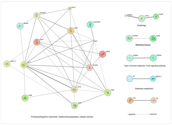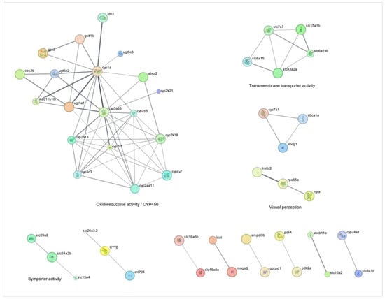Network analysis of drug-metabolizing enzymes-related genes overexpressed during injury-induced inflammation in zebrafish larvae treated with TnP compared to untreated control. Protein-protein interaction (PPI) networks of 74 differentially overexpressed genes (padj < 0.05). The PPI network was performed in STRING on Cytoscape, and each subnetwork was evaluated in the software to provide the main functional enrichment term through STRING. The bigger the circle, the lower the adjusted p-value. Singletons were omitted from the network.