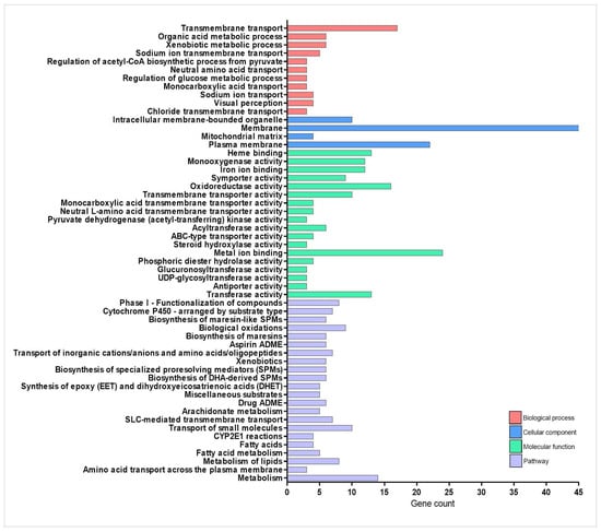 Protein-protein interactions network of upregulated DEGs identified in the study was performed in STRING on Cytoscape v3.10.3 [35] for the following expert-driven categories: (I) drug metabolizing enzymes, (II) cellular traffic, (III) cell activity, and (IV) signaling pathways. STRING is an established tool for interpreting and reducing newly acquired genetic screening datasets, and its link to functional associations helps to suggest evidence of a specific partnership between two proteins [36]. In addition, functional enrichment analysis was conducted using DAVID software v2023q4 [37], where enriched terms were considered significant if the adjusted p-value was less than 0.05 and the gene count at least 3.