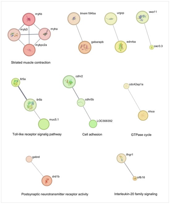 - Szklarczyk, D.; Kirsch, R.; Koutrouli, M.; Nastou, K.; Mehryary, F.; Hachilif, R.; Gable, A.L.; Fang, T.; Doncheva, N.T.; Pyysalo, S.; et al. The STRING database in 2023: Protein-protein association networks and functional enrichment analyses for any sequenced genome of interest. Nucleic Acids Res. 2023, 51, D638–D646. [Google Scholar] [CrossRef] [PubMed]