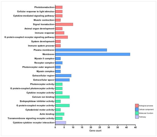 Cleaned data were mapped to the Danio rerio reference transcriptome provided by Ensembl GRCz11 V.109, and the transcripts were quantified with the Salmon tool, version 0.8.2 [30]. Then, the gene expression matrix was constructed using quantified transcripts with the R/Bioconductor Tximeta package, version 1.0.3 [31]. We used the ensemble packages org.Dr.eg.db to annotate the quantified transcripts according to V.109 of the reference ensemble used for quantification [32,33].