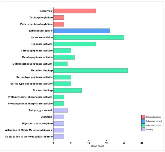 Enrichment analysis of drug-metabolizing enzymes-related genes overexpressed during injury-induced inflammation in zebrafish larvae treated with TnP compared to untreated control. Functional enrichment analysis focusing on the overexpressed genes list (71 DAVID IDs) related to drug-metabolizing enzymes using the DAVID software. Terms were considered significant if the adjusted p-value was less than 0.05 and the gene count at least 3.