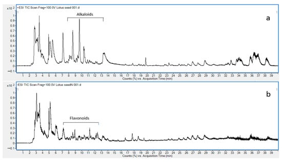 LC-ESI-QTOF-MS/MS has been a widely used analytical technique for the structural elucidation of natural compounds. The accurate mass data and fragmentation pattern of each compound are unique and can be used to profile chemical constituents in crude extract, which is essential for quality control to ensure safety and efficacy. The total ion chromatogram of LSE performed in both positive mode and negative mode is shown in Figure 1. The proposed alkaloids and flavonoids are demonstrated in Supplementary Table S1.