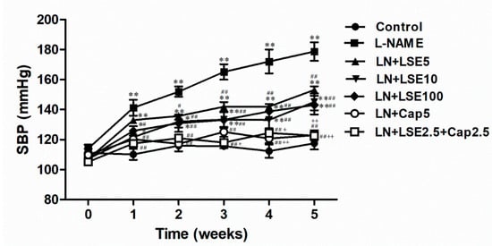 Captopril was used as a reference drug to evaluate its antihypertensive effect in L-NAME-induced hypertensive rats. The selected doses of LSE (5, 10, and 100 mg/kg), L-NAME (40 mg/kg), and captopril (5 mg/kg) were based on data from a previous study [23].