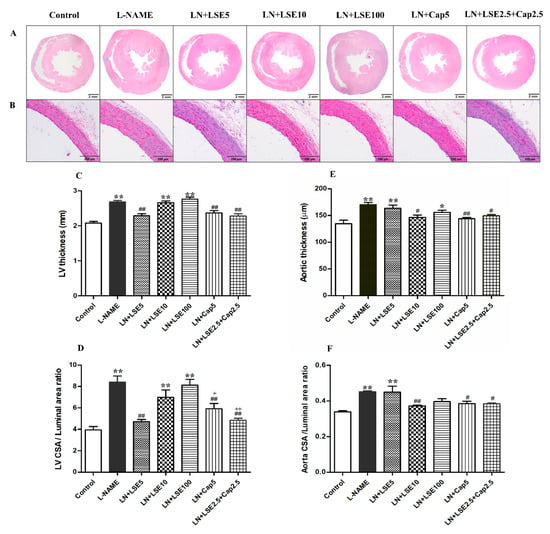 Effects of LSE and captopril on cardiovascular morphology in L-NAME-induced hypertensive rats. Representative hematoxylin and eosin-stained section observed under a light microscope: (A) Cross-section of the rat heart at 1.25× magnification (scale bar = 2 mm), and (B) cross-section of the abdominal aorta at 20× magnification (scale bar = 200 µm). Quantitative analyses of cardiovascular remodeling are represented as (C) left ventricular (LV) wall thicknesses, (D) LV cross-section area to luminal area ratio, (E) abdominal aortic wall thickness, and (F) aortic cross-section area to luminal area ratio. Values are expressed as mean ± SEM (n = 5–6). * p < 0.05, ** p < 0.01 vs. control, # p < 0.05, ## p < 0.01 vs. L-NAME, + p < 0.05, ++ p < 0.01 versus LSE 100. CAP, captopril; L-NAME or LN, Nω-nitro-L-arginine methyl ester; LSE, lotus seed extract; LV, left ventricular.