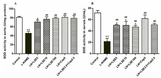 L-NAME-induced hypertensive rats exhibited decreased SOD activity in both aorta and serum (p < 0.01 vs. control, Figure 4). Treatment with LSE (5, 10, and 100 mg/kg), captopril (5 mg/kg), or their combination (2.5 mg/kg each) elevated SOD activity (p < 0.05, 0.01 vs. L-NAME, Figure 4A,B).