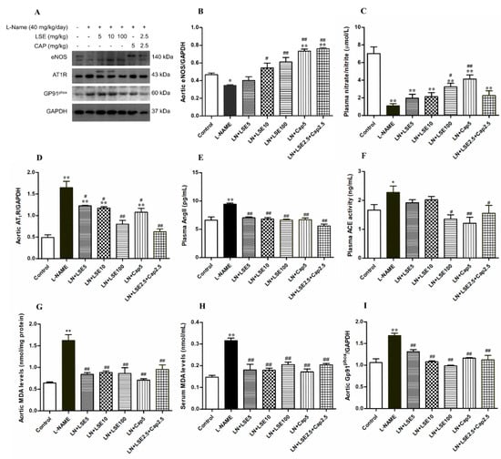 Effects of LSE and captopril on NO metabolites, RAS production, and oxidative stress markers in L-NAME-induced hypertensive rats. (A) Representative bands of the eNOS, AT1R, and Gp91phox expression in aortic tissues, as investigated by western blot analysis. The quantitative results of the expression of aortic eNOS (B), plasma nitrate/nitrite (C), aortic AT1R (D), plasma Ang II (E), ACE activity (F), aortic MDA (G), serum MDA (H), Gp91phox (I), in each group. Values are expressed as mean ± SEM. (n = 4–6). * p < 0.05, ** p < 0.01 versus control, # p < 0.05, ## p < 0.01 versus L-NAME. ACE, angiotensin converting enzyme; Ang II, angiotensin II; CAP, captopril; L-NAME, LN, Nω-nitro-L-arginine methyl ester; LSE, lotus seed extract; MDA, malondialdehyde.