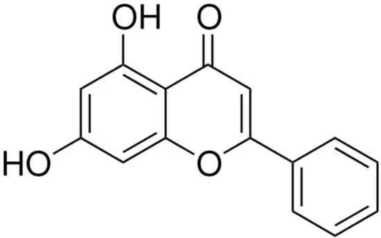 Chrysin, also known as 5,7-dihydroxyflavone, is a member of the flavonoid family. It is a naturally occurring compound extracted from various plants, including Passiflora caerulea (blue passionflower), Passiflora incarnata (purple passionflower), Oroxylum indicum, Cytisus multiflorus, Crataegus oxyacantha, Pelargonium crispum, Scutellaria immaculata, and Alpinia oxyphylla [10,11]. Additionally, chrysin is found in different types of honey and propolis [12], as well as in certain edible mushrooms such as Pleurotus ostreatus (oyster mushroom) [13]. Chemically, chrysin belongs to the class of dihydroxyflavones, characterized by hydroxyl groups attached solely to the aromatic A-ring—specifically at the 5 and 7 positions—distinguishing it from other flavones (Figure 1). In plants, the biosynthesis of chrysin originates from the amino acid phenylalanine, which is converted into cinnamic acid through the action of the enzyme L-phenylalanine ammonia-lyase (PAL) [14,15]. Chrysin is a lipophilic compound with a low molecular weight (MW = 254.24 g/mol). Its aqueous solubility is limited, with values of 0.06 ± 0.1 mg/mL at pH 6.5 and 0.058 ± 0.04 mg/mL at pH 7.4. In the human body, chrysin exhibits poor absorption, is rapidly metabolized, and promptly eliminated, resulting in very low bioavailability [16]. This is primarily due to its high susceptibility to phase II metabolic enzymes, particularly UDP-glucuronosyltransferases (UGTs), which catalyze glucuronidation and sulfonation reactions leading to its rapid clearance [17,18,19].