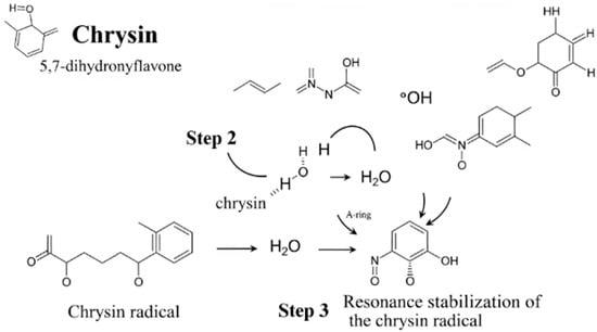 Through this mechanism, chrysin effectively terminates the chain reaction of damage to important cellular components, such as proteins, lipids, and DNA [56]. Simplified mechanism of free radical scavenging by chrysin can be found in Figure 2.