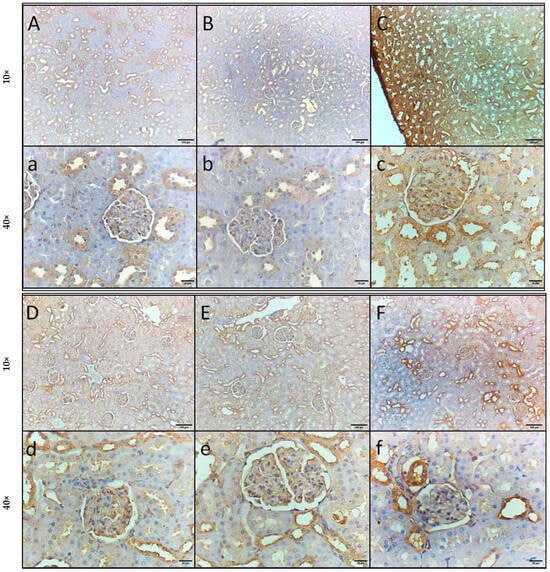 Inflammation Biomarkers: Sirtuin-1 (SIRT1) (BT LABORATORY, Beijing, China, E1145Ra), tumor necrosis factor α (TNF-α) (CUSABIO, Houston, TA, USA, CSB-E11987r), Toll-like receptor 4 (TLR4) (CUSABIO, Houston, TA, USA, CSB-E15822r), myeloid differentiation primary response 88 (MYD88) (Assay Genie, Dublin, Ireland, RTFI01303), and interleukin-1β (IL-1β) (CUSABIO, Houston, TA, USA, CSB-E08055r) were quantified in kidney homogenate using ELISA kits according to the manufacturer’s instructions. The assay utilized a double-antibody sandwich ELISA method, and the optical density (O.D.) of the final product was measured with a spectrophotometer at 450 nm using an ELISA microplate reader (BioTek Instruments ELx800, Winooski, VT, USA).