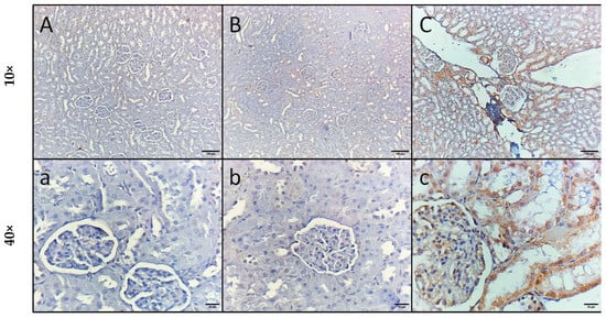 The renal content of high-mobility group box 1 (HMGB1) and nuclear factor-κB (NF-κB) was evaluated using immunohistochemistry techniques. Briefly, antigen retrieval was carried out after deparaffinization and rehydration. The sections were incubated overnight at 4 °C with a rat polyclonal antibody (Thermo Scientific, Rockford, IL, USA). After washing, the samples were treated with a goat anti-rat secondary antibody (Genemed Biotechnologies, Torrance, CA, USA)for 2 h at room temperature and visualized using diaminobenzidine. The sections were subsequently analyzed under a light microscope (Leica, Cambridge, UK). Appropriate controls were performed to rule out background or non-specific binding [67]. Using ImageJ software version 1.51r (NIH, Bethesda, MD, USA), the positively stained areas were identified blindly, and the mean of six readings from the left renal sections was calculated for each rat.