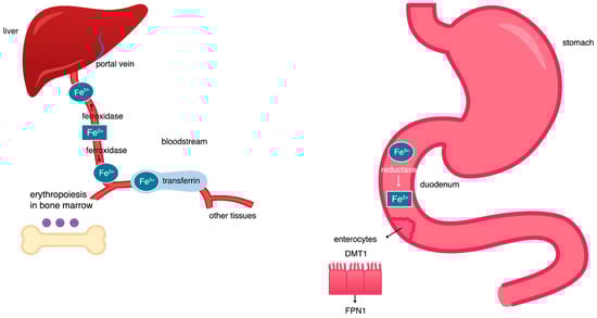 The connection between iron and ferroptosis requires a review of iron homeostasis and an understanding of the mechanisms leading to an increase in iron levels in cells and the organism as a whole. Iron is a metallic trace element essential for the life of humans and all vertebrate species []. The element ingested with food in the form of ferric ions Fe3+ is solubilized and ionized in the stomach by the action of gastric acid []. Then, under the influence of reductase, the insoluble Fe3+ ions are reduced to more-easily absorbed ferrous Fe2+ ions, and, in this form, they are absorbed in the duodenum. Divalent cation transporters (DMT1, DCT1) and ferroportin 1 (FPN1) are responsible for transporting the absorbed iron ions from the surface of enterocytes to their cytoplasm and then to the bloodstream []. DMT1 enables the transport of Fe2+ ions into the cytoplasm of enterocytes, and ferroportin supports the export of iron from these cells to the portal vein circulation. The portal vein transports iron to the liver, where its largest storage is located []. Hepatocytes secrete the hormone hepcidin, which lowers blood iron levels by inhibiting iron export from enterocytes []. Hepcidin binds to ferroportin, causing conformational modification of ferroportin, and therefore directs ferroportin to the ubiquitination process. This leads to endocytosis of the attached molecules and their lysosomal degradation. Degradation of ferroportin blocks the release of iron into the plasma, thereby lowering blood iron levels [].