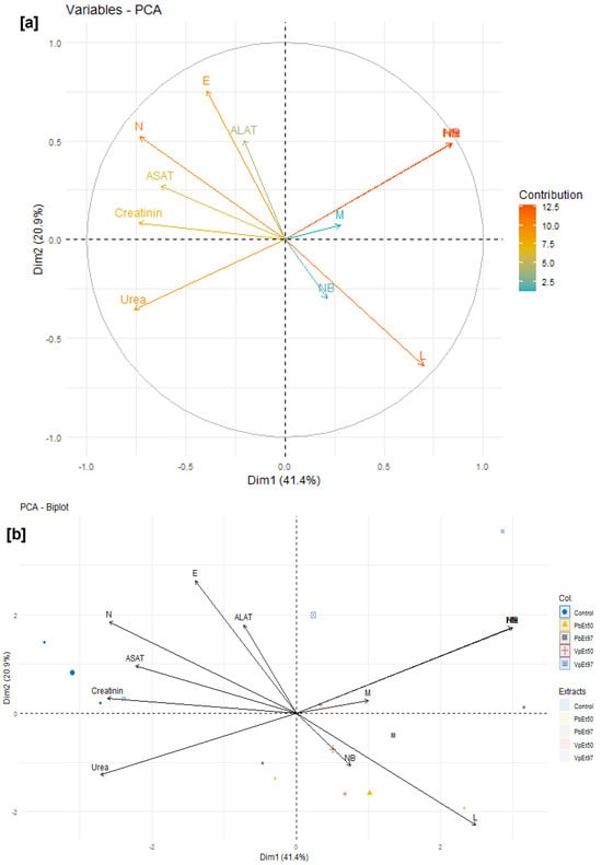 V. paradoxa stem bark extracts. Principal component analysis identified hemoglobin, hematocrit, and red blood cell count as the most influential parameters. These positively correlated parameters, which increase with plant extract administration, support the safety of the extracts. Conversely, higher levels of neutrophils, eosinophils, and liver/kidney function markers in the placebo group suggest no toxic effects from the extracts. Overall, these results support the non-toxic nature of