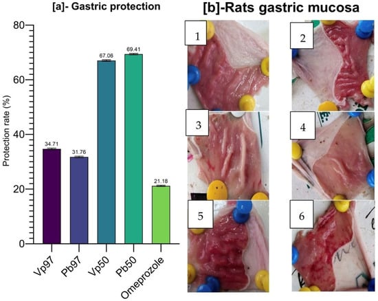 P. biglobosa—surpassing even the reference drug, omeprazole, which had a protection rate of only 21.18%. These results indicate a strong therapeutic potential for these extracts against gastric mucosal injury. Both