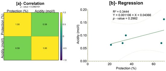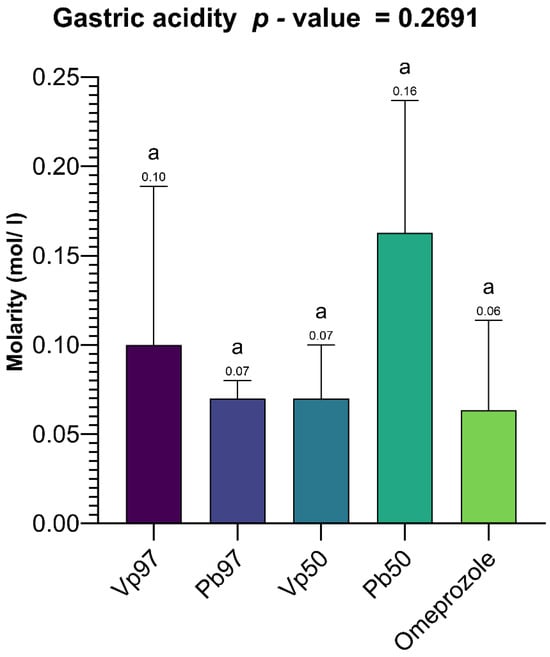 p = 0.2982 > 0.05) suggests that acidity alone does not fully explain the extracts’ protective effects. This indicates the involvement of multiple mechanisms, potentially including enhanced gastric mucus secretion, antioxidant activity, anti-inflammatory effects, Gastric H
