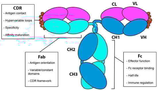 As shown in Figure 3, human antibodies, such as immunoglobulin G (IgG), are glycoproteins composed of two identical light chains (LCs) and two identical heavy chains (HCs) that associate to form a Y-shaped monomer. The light chains consist of a constant domain (CL, light chain constant domain) and a variable domain (VL, light chain variable domain). Similarly, the heavy chains are composed of a constant domain (CH, heavy chain constant domain) and a variable domain (VH, heavy chain variable domain). The structure of the antibody can be divided into two main regions: the antigen-binding fragment (Fab), responsible for antigen recognition, and the crystallizable fragment (Fc), which interacts with immune cell receptors and mediators of the immune system. Within the Fab region, the complementarity-determining regions (CDRs) are hypervariable loops that confer specificity to the antibody, enabling it to recognize a wide array of antigens. Understanding the relationship between antibody structure and function is fundamental for achieving the desired therapeutic response, especially considering the importance of affinity and avidity in the efficacy of interactions between the antibody and target antigens [32,33].
