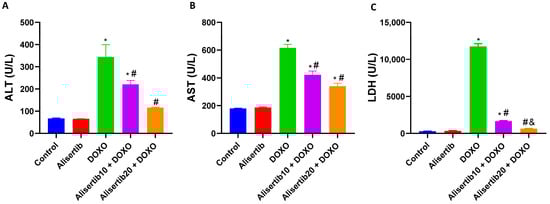 Effect of alisertib (10 and 20 mg/kg) on serum levels of (A) alanine aminotransferase (ALT), (B) aspartate aminotransferase (AST), and (C) lactate dehydrogenase (LDH) in doxorubicin (DOXO)-intoxicated mice. Data are expressed as means ± SEs (n = 6). *, #, and & indicate significant differences compared to the control, DOXO, and alisertib10 + DOXO groups, respectively, using one-way ANOVA followed by the Tukey–Kramer multiple-comparisons post hoc test.