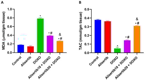 Effect of alisertib (10 and 20 mg/kg) on hepatic levels of (A) malondialdehyde (MDA) and (B) total antioxidant capacity (TAC) in doxorubicin (DOXO)-intoxicated mice. Data are expressed as means ± SEs (n = 6). *, #, and & indicate significant differences compared to the control, DOXO, and alisertib10 + DOXO groups, respectively, using one-way ANOVA followed by the Tukey–Kramer multiple-comparisons post hoc test.