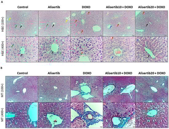 Liver tissue sections from the experimental groups were stained with H&E and MT stains to address necroinflammatory and fibrotic lesions, represented in Figure 3A and Figure 3B, respectively. Our results showed that liver sections from the DOXO group showed central vein and portal triad congestion and dilatation, increased Kupffer cell activity, and hepatocyte vacuolation and necrosis, in addition to high fibrosis and bridging between the portal triads and central veins when compared to the control group. However, these hepatic pathological abnormalities were attenuated in the alisertib10 + DOXO group, demonstrating mild central vein and portal triad congestion and dilatation, minimal activity of Kupffer cells, and minimal hepatocyte necrosis, along with mild fibrosis in the walls of the portal triads with minimal fibrosis in the walls of central veins. Otherwise, treatment with alisertib (20 mg/kg) with DOXO resulted in minimal central vein dilatation with restoration of normal hepatic architecture, as well as minimal fibrosis in the walls of the portal triads and central veins.