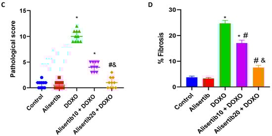 These necroinflammatory changes were scored, and the fibrotic percentages were determined for further illustration (Figure 3C and Figure 3D, respectively). Our data revealed a significantly (p < 0.001) greater pathological score and percentage of fibrosis in the DOXO group when compared to the control counterpart. However, treatment with alisertib (10 mg/kg) with DOXO reduced the pathological score (by about 59.4%) and percentage of fibrosis (by about 31.1%) compared to DOXO alone. Otherwise, a higher dose of alisertib (20 mg/kg) showed a significantly superior effect to the lower dose and reduced the pathological score (by about 90.1%) and the percentage of fibrosis (by about 69.7%) compared to DOXO alone.