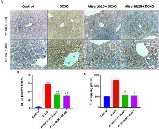 (A) Representative micrographs of immuno-stained liver tissue sections demonstrating the effect of alisertib (10 and 20 mg/kg) on nuclear factor kappa B (NF-κB) expression in doxorubicin (DOXO)-intoxicated mice (upper panel: ×10, bar = 100 µm; lower panel: ×40, bar = 20 µm). The control group shows normal hepatic architecture with minimal NF-κB immunoreactivity in a few hepatocytes. The DOXO group shows intense immunoreactivity in all hepatocytes. The alisertib10 + DOXO group shows moderate immunoreactivity in all hepatocytes. The alisertib10 + DOXO group shows mild immunoreactivity in most of the hepatocytes. (B) Corresponding percentages of NF-κB immunoexpression-positive areas. (C) Effect of alisertib (10 and 20 mg/kg) on hepatic levels of NF-κB in DOXO-intoxicated mice. Data are expressed as means ± SEs. * and # indicate significant differences compared to the control and DOXO groups, respectively, using one-way ANOVA followed by the Tukey–Kramer multiple-comparisons post hoc test.