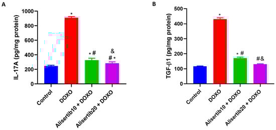 Effect of alisertib (10 and 20 mg/kg) on hepatic levels of (A) interleukin (IL)-17A and (B) transforming growth factor (TGF) β1 in doxorubicin (DOXO)-intoxicated mice. Data are expressed as means ± SEs (n = 6). *, #, and & indicate significant differences compared to the control, DOXO, and alisertib10 + DOXO groups, respectively, using one-way ANOVA followed by the Tukey–Kramer multiple-comparisons post hoc test.