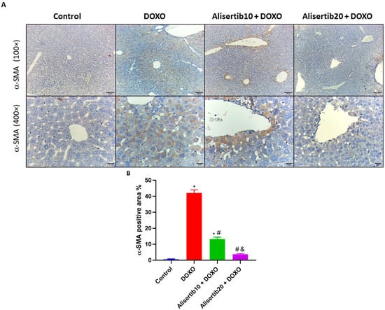 (A) Representative micrographs of immuno-stained liver tissue sections demonstrating the effect of alisertib (10 and 20 mg/kg) on alpha smooth muscle actin (α-SMA) expression in doxorubicin (DOXO)-intoxicated mice (upper panel: ×10, bar = 100 µm; lower panel: ×40, bar = 20 µm). The control group shows normal hepatic architecture with no α-SMA immunoreactivity. The DOXO group shows intense immunoreactivity in perivascular hepatocytes. The alisertib10 + DOXO group shows intense immunoreactivity in some perivascular hepatocytes. The alisertib20 + DOXO group shows minimal immunoreactivity in a few perivascular hepatocytes. (B) Corresponding percentages of α-SMA immunoexpression-positive areas. Data are expressed as means ± SEs. *, #, and & indicate significant differences compared to the control, DOXO, and alisertib10 + DOXO groups, respectively, using one-way ANOVA followed by the Tukey–Kramer multiple-comparisons post hoc test.