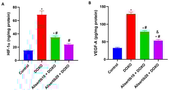 Effect of alisertib (10 and 20 mg/kg) on hepatic levels of (A) hypoxia-inducible factor (HIF)-1α and (B) vascular endothelial growth factor (VEGF)-A in doxorubicin (DOXO)-intoxicated mice. Data are expressed as means ± SEs (n = 6). *, #, and & indicate significant differences compared to the control, DOXO, and alisertib10 + DOXO groups, respectively, using one-way ANOVA followed by the Tukey–Kramer multiple-comparisons post hoc test.
