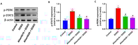 (A) Representative Western blot images demonstrating the effect of alisertib (10 and 20 mg/kg) on hepatic phosphorylated signal transducer and activator of transcription 3 (p-STAT3) and phosphorylated protein kinase RNA-like endoplasmic reticulum kinase (p-PERK). (B,C) Corresponding hepatic relative expression levels of p-STAT3 and p-PERK. Data are expressed as means ± SEs (n = 3). * and # indicate significant differences compared to the control and DOXO groups, respectively, using one-way ANOVA followed by the Tukey–Kramer multiple-comparisons post hoc test.