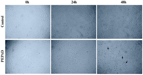 Morphological changes in B16F10-Nex2 cells treated and untreated with PEPAD at 7.4 µM, at 0 h, 24 h, and 48 h. Arrows indicate some cells with chromatin condensation.